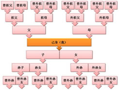 "九族"也是指親屬。但"九族"所指,同樣諸說不同。一說是上自高祖、下至玄孫,即玄孫、曾孫、仍孫(古時(shí)稱從本身下數(shù)第八世孫為仍孫)、子、身、父、祖父、曾祖父、高祖父;一說是父族四、母族三、妻族二,父族四是指姑之子(姑姑的子女)、姊妹之子(外甥)、女兒之子(外孫)、己之同族(父母、兄弟、姐妹、兒女);母族三是指母之父(外祖父)、母之母(外祖母)、從母子(娘舅);妻族二是指岳父、岳母。隨著時(shí)代的變遷,今日"九族"之意有了很大變化,其親屬之意已經(jīng)淡出,變成了對(duì)與之有關(guān)的一切人的泛稱。