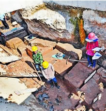 8月以來,市考古隊(duì)進(jìn)駐屏山地鐵站工地,配合地鐵施工,在面積達(dá)3400多平方米的地塊進(jìn)行搶救性發(fā)掘。發(fā)掘現(xiàn)場共有28個探方。整個發(fā)掘現(xiàn)場分為東、西兩個部分。東半部從明清地層挖到西漢地層。東半部地層內(nèi),自南向北貫穿著一個上世紀(jì)七十年代修筑的人防工程——防空洞。防空洞直徑五六米、深六七米,后來被水泥堵了。[詳細(xì)]