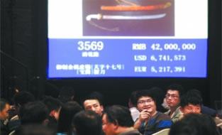 2012嘉德秋拍中備受關(guān)注的國寶——一件乾隆年間御制重器“金桃皮鞘‘天字十七號’‘寶騰’腰刀”以4830萬元(含傭金)價格被一位澳門買家收入囊中。據(jù)介紹,這把皇家御制編號為“天字十七號”、刀名為“寶騰”的腰刀是乾隆帝親自監(jiān)督,造辦處耗時47年傾力打造的90把御制腰刀之一,這90把腰刀以“天、地、人”三字編號,每字號各30把,寶刀象征著皇帝權(quán)力和威勢。除少量的外撥和流失海外,這90把腰刀絕大部分現(xiàn)收藏在北京故宮博物院。參與競拍的這把腰刀是目前所知民間僅存的乾隆御制腰刀,曾為海外舊藏,是國家一級文物。[詳細(xì)]