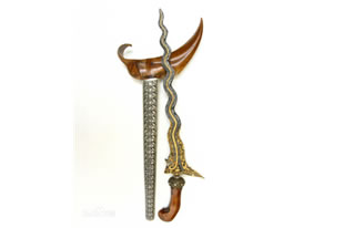 馬來克力士劍興盛于13世紀(jì)的滿者伯夷王國,屬于糙面隕鐵焊接花紋刃中的尖端精品,精美絕倫。其制造工藝極為精細(xì),僅反復(fù)錘鍛入火一道工序就要重復(fù)500次左右,刃上的夾層鋼有600層之多。[詳細(xì)]