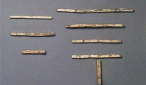 數(shù)學(xué)界推測,算籌的發(fā)明應(yīng)與蓍草占卜有關(guān)聯(lián)。蓍草是植物的莖,古代巫師喜歡用它來占卜,占卜的過程其實(shí)就是一個(gè)運(yùn)算過程,通過所得結(jié)果、根數(shù)的變化來判斷吉兇。算籌就是由算卦用的蓍草演化成“策”,再演化成“籌”。算籌可由竹、木、玉、骨等材料制成。《漢書·律歷志》記載,西漢時(shí)的算籌“長六寸”,多為竹質(zhì)。