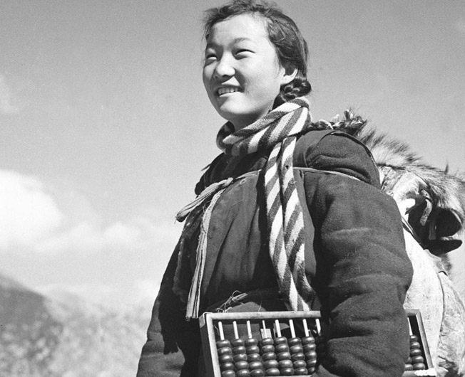 3. 在西藏工布江達(dá)縣太昭鄉(xiāng)的小道上,被譽(yù)為“我們的好售貨員”的德欽楊宗手拿算盤上班。1960年12月,20歲的她出席西藏全區(qū)先進(jìn)集體和先進(jìn)生產(chǎn)者代表大會。(新華社記者 林熒攝 1961年4月3日 發(fā))