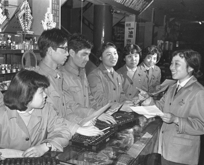 5. 在各類勞動技能大賽上,打算盤一直是保留項(xiàng)目。圖為上海第四百貨商店黨團(tuán)組織舉行業(yè)務(wù)比賽,青年?duì)I業(yè)員在比珠算。(新華社稿 顏志剛 攝 1979年5月9日 發(fā))