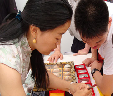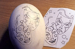 將蛋置于“定標(biāo)線器”上,將蛋殼依據(jù)設(shè)計(jì)圖稿將等分線,并行線畫(huà)好,然后將細(xì)部圖案依固定位置劃上。