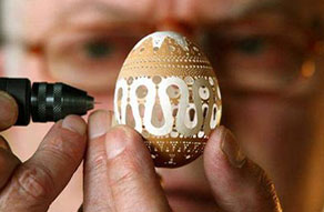 運(yùn)用各種不同的工具,依蛋殼上所畫(huà)的設(shè)計(jì)圖稿鉆孔,透雕,切割不周的部位,最后用鋸片將活動(dòng)部份切開(kāi)來(lái),成形。