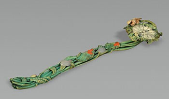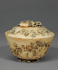 2010秋拍寬以居藏文房珍玩專場(chǎng)中,清乾隆象牙雕彩繪瓜瓞綿綿紋蓋碗估價(jià)25至35萬(wàn)元,成交價(jià)為¥134萬(wàn)。蓋碗瓜蔓纏繞,枝繁葉茂,連綿不絕,并雕有兩只蝴蝶在其間翩翩起舞,寓子孫延續(xù)、昌盛繁榮之美意。蓋面花團(tuán)錦簇,瓜果枝葉仰覆掩映,錯(cuò)落有致。這件牙雕碗的形狀雕刻打磨及染色工藝都顯示著“造辦處”的特征。