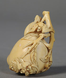 2010秋拍寬以居藏文房珍玩專場(chǎng)中,清乾隆象牙雕福壽桃形鏈瓶估價(jià)為15至20萬(wàn)元,成交價(jià)為80.64萬(wàn)元。我們?cè)趯m廷的收藏中,也看到多件類似的鏈瓶作品。鏈瓶從工藝設(shè)計(jì)這個(gè)層面來(lái)說(shuō),它的動(dòng)機(jī)有很大的部分是在“炫技”。通常在狹小的空瓶?jī)?nèi),再裝有微雕的動(dòng)物以及印章等多件精小的物品,互相鏈接聯(lián)系在一起。