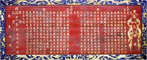 國(guó)內(nèi)專題以圣旨為載體的皇牘文化博物館,館內(nèi)收藏著明清圣旨數(shù)十道,有從大清開國(guó)皇帝順治到末代皇帝溥儀十代皇帝的圣旨,承接不輟,堪稱中華首家,在館藏20余道誥命圣旨中,其中一件堪稱孤品的圣旨跨越兩代君王,是道光,咸豐二帝封爵奉恩將軍奎定及其子玉綱世襲的。即襲罔替之說(shuō)的圣旨。[詳細(xì)]