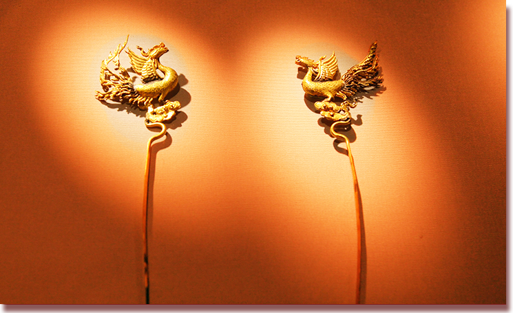金鳳簪,明代文物, 1972年南城縣洪湖公社益端王夫婦合葬墓出土,現(xiàn)藏江西省文物考古研究所。金鳳簪除鳳頭用金片成形外,全身都采用累絲法制成。金鳳腳踏朵云,昂首挺胸,碩大美麗的五根尾羽向上翻卷,玲瓏剔透,精美絕倫。簪腳上分別鏨刻“銀作局永樂貳十貳年拾月內(nèi)成造玖成色金貳兩外焊貳分”字樣。