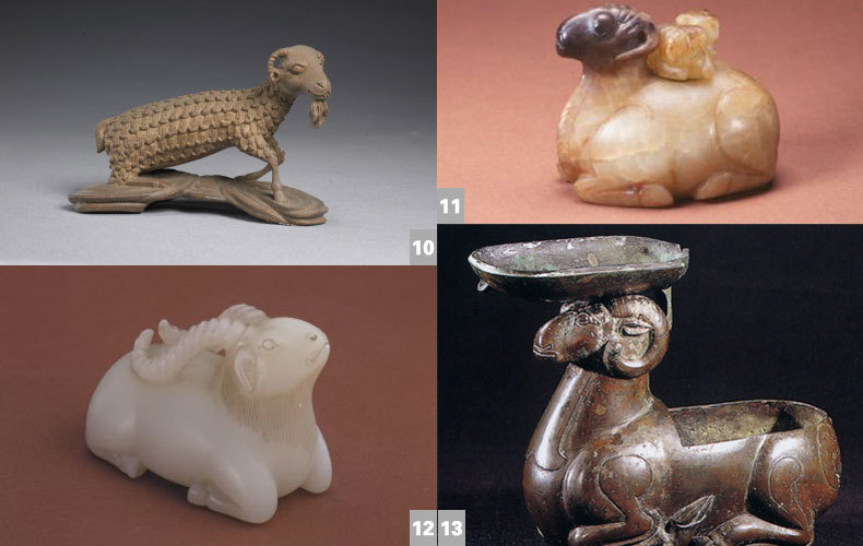 唐,高8cm,體長(zhǎng)15.4cm。臥羊頭大,頸粗,眼圓睜,雙角在頭兩側(cè)卷曲,角上雕出較細(xì)密的線狀年輪紋,頸部雕有較密集的點(diǎn)線狀紋飾。羊身體各部位骨肌清晰,四肢匍匐呈臥姿。作品巧妙地采用局部點(diǎn)線紋飾來(lái)表現(xiàn)整體濃密的羊毛,頗具立體效果。(田軍)