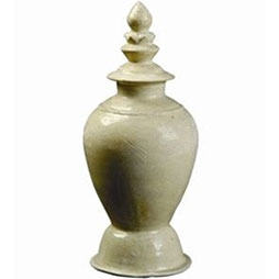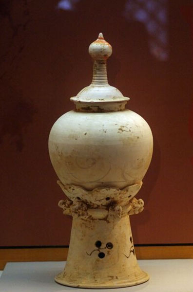 唐代鞏義窯白瓷塔蓋瓶,以其潔白如玉的釉色和獨具匠心的造型受到專家的推崇,成為專家所挑選文物中的首選。該瓶通高39.4厘米,口徑8.4厘米,底徑15.7厘米,腹徑17.4厘米。胎質(zhì)潔白,光滑潤亮,造型美觀大方。蓋分四層,最上層為佛光寶珠,其下為七棱形座,再下為圓臺形座,最下層為覆碗座,與上部連為一體成塔頂。瓶侈口,圓唇、卷沿、鼓腹、深圈足、足呈覆碗形,肩部有一道弦紋,通體呈乳白色,胎質(zhì)堅實細密。從遠處望去,這件塔蓋瓶好像微縮的佛塔造型,精致、渾圓、飽滿、靈秀,在舉行盛大的佛教活動時,總有這件塔蓋瓶的身影。最初,它是盛水或酒的容器,后被作為主人的心愛之物隨葬于墓中。從這件塔蓋瓶的身上,我們就能領(lǐng)略到鞏義窯址白瓷的藝術(shù)魅力。[詳細]