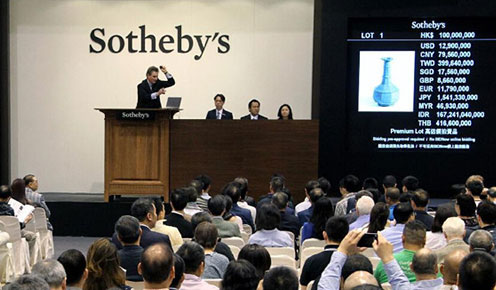 古董板塊一向是香港蘇富比的傳統(tǒng)強(qiáng)項(xiàng),本次春拍的最大看點(diǎn)就是“南宋官窯青釉八方弦紋盤(pán)口瓶”。傳世官窯在市場(chǎng)上十分罕見(jiàn),因此這件盤(pán)口瓶備受各方看好。 在當(dāng)天的拍場(chǎng)上,此官窯瓶以4800萬(wàn)港元起拍后,由坐在第一排的藏家張宗憲搶先叫到5000萬(wàn)港元,隨后有約五位現(xiàn)場(chǎng)和電話委托買(mǎi)家加入競(jìng)爭(zhēng),最終由一位電話委托買(mǎi)家以1億港元競(jìng)得。加上傭金,成交價(jià)為1.1388億港元。據(jù)悉,該件拍品買(mǎi)家是來(lái)自上海的藏家劉益謙?!半m然這件官窯瓶拍出高價(jià)對(duì)市場(chǎng)的參考意義不大,但是整個(gè)宋代瓷器會(huì)在未來(lái)幾年內(nèi)有更大的上升空間?!碧K富比中國(guó)藝術(shù)品部門(mén)國(guó)際主管仇國(guó)仕認(rèn)為,收藏宋瓷不光要有經(jīng)濟(jì)實(shí)力,眼力也很重要,宋瓷尤其是精品宋瓷未來(lái)會(huì)受到更多的重視。 [詳細(xì)]