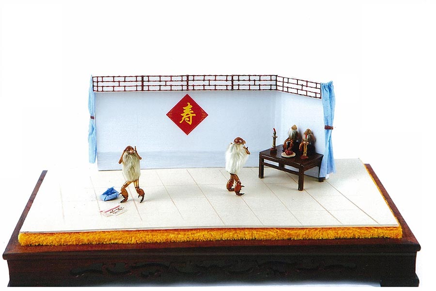 相傳毛猴起源于清同治年間,當(dāng)時(shí)在宣武門外騾馬市大街有一家藥鋪,名為“南慶仁堂”,當(dāng)家的掌柜非常尖酸霸道。某日,藥鋪里一配藥的小伙計(jì)又無(wú)端地被掌柜一頓臭罵,憋了一肚子悶氣。到了晚上,小伙計(jì)整理蟬蛻時(shí),偶然發(fā)現(xiàn)蟬蛻那尖尖的頭殼和細(xì)小的四肢,像極了尖嘴猴腮的掌柜,不由心中一動(dòng),取來(lái)辛荑做身子,截取蟬蛻的頭做腦袋,前腿做下肢,后腿做上肢,用白芨粘好,一個(gè)微縮版的“掌柜”便做好了。小伙計(jì)也就是圖個(gè)開心,根本沒(méi)有想到自己創(chuàng)造了一項(xiàng)風(fēng)靡北京數(shù)百年的民間工藝品——毛猴。[詳細(xì)]