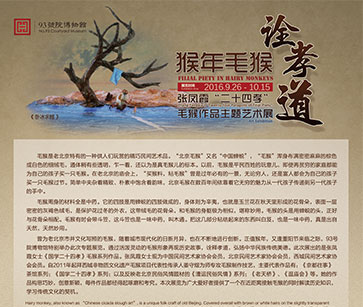 毛猴屬于老北京的民間絕活兒之一,是陪伴無(wú)數(shù)北京孩子童年的玩具。猴子作為自然界的小精靈,它機(jī)敏、活潑,透著一種天然情趣。毛猴藝術(shù)將猴子的天然情趣和藝術(shù)家的創(chuàng)作完美結(jié)合,創(chuàng)造了一種絕妙的藝術(shù)境界。時(shí)值猴年,又逢重陽(yáng)節(jié)來(lái)臨之際,本次展覽展出張鳳霞女士《國(guó)學(xué)二十四孝》毛猴系列作品,通過(guò)活潑靈動(dòng)的毛猴形象再現(xiàn)歷史故事,詮釋孝道,弘揚(yáng)中華民族傳統(tǒng)美德。[詳細(xì)]