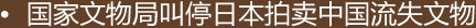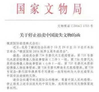 日本某拍賣公司原計(jì)劃10月底拍賣數(shù)件中國(guó)流失文物一事,已被國(guó)家文物局發(fā)函叫停。目前這些文物已撤拍。國(guó)家文物局表示,對(duì)于任何確認(rèn)為非法流失的中國(guó)文物,將保留追索的權(quán)利。[全文]