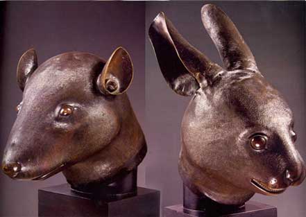 青銅鼠首和兔首原為北京圓明園大水法十二生肖獸首噴泉構(gòu)件中的兩件,1860年英法聯(lián)軍火燒圓明園后流失。2009年2月,境外某機(jī)構(gòu)舉行兩件獸首拍賣,最終,兩件獸首被法國(guó)皮諾家族購(gòu)得,并以其家族名義歸還中國(guó)。[詳細(xì)]