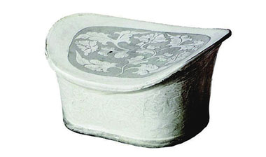 此枕呈腰圓形,枕面剔刻折枝牡丹,花卉枝葉疏朗,花瓣及葉片上箆劃筋脈,線條流暢,紋飾雋美,精致而素雅大方,為孟家井窯瓷器中的精品。[詳細(xì)]