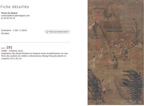 法國當(dāng)?shù)貢r間6月19日,在法國一家名為"Thierry De Maigret"的拍賣中,一件標明為唐代張萱《唐后行從圖》從1500歐元起拍,最終的成交價達到了375萬歐元。由于此次拍賣行對于這幅作品并沒有十分重視,也未標注年代,因為事先并沒有被新聞界所關(guān)注,但是許多國內(nèi)大行家卻從各種渠道了解到這次拍賣,并高度關(guān)注,最終以天價成交。[詳細]