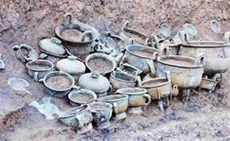 葉家山墓地第一大墓葬M111墓已發(fā)掘出5件方鼎、11件圓鼎、3件大鑊鼎和12件簋,共計(jì)19鼎12簋。經(jīng)初步測(cè)算,圓鼎直徑約為20公分,三件大鑊鼎直徑為35公分至45公分,分布明確,保存完好。數(shù)量超過周朝傳統(tǒng)禮制中最高規(guī)格的"九鼎八簋"。為目前國(guó)內(nèi)西周考古發(fā)掘中,在同一墓葬中發(fā)現(xiàn)最多的鼎和簋。[詳細(xì)]