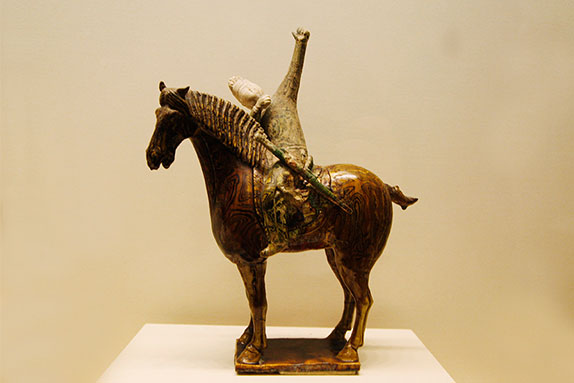 騎馬出游和狩獵是唐代上層階級(jí)休閑娛樂(lè)的一種方式,狩獵活動(dòng)和騎馬出游也成了唐代繪畫(huà)、雕塑、詩(shī)歌等藝術(shù)的創(chuàng)作題材。騎馬狩獵俑和出行俑便是在這種背景下的產(chǎn)物。威武的胡人和矯健的胡馬是唐代詩(shī)歌、繪畫(huà)、雕塑等藝術(shù)形式中常見(jiàn)的題材,反映了長(zhǎng)安作為國(guó)際大都會(huì)的開(kāi)放與繁榮。在騎馬或騎駝俑中,男性胡人俑比較常見(jiàn)。在這些騎馬出游和狩獵活動(dòng)中,甚至還有女性形象的出現(xiàn),由此可見(jiàn),唐朝是一個(gè)寬容開(kāi)放的朝代,婦女可不僅以拋頭露面到市街游玩,還可以參加打球、射獵等活動(dòng)。婦女騎馬在唐代繪畫(huà)、雕塑和文學(xué)中都有生動(dòng)的表現(xiàn),且常著胡服,唐代上層?jì)D女著胡服騎馬出游是一種社會(huì)風(fēng)氣。[詳細(xì)]