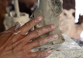 在枯木陶的塑型方法上,它采用的是捏制法,不借助任何的模具,只需要一些很簡單的工具純手工操作。