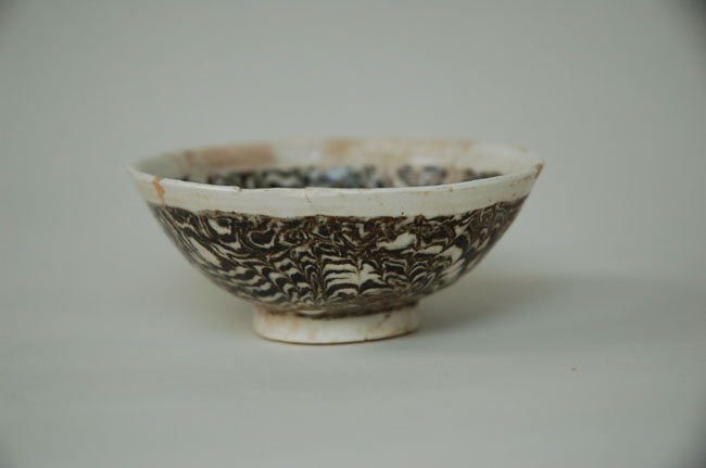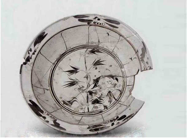 在當(dāng)陽(yáng)峪所收集的瓷片和器物之中,鐵繪的裝飾技法很多。它的工藝技法是在坯體上過(guò)白化狀土后,在泥坯干燥之前用黑色繪料(一種含三氧化鐵的礦物質(zhì)繪料)快速將紋樣繪成。所以,畫工必須具備熟練的技巧,以較快的速度一氣呵成。